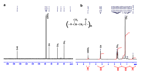 Fig. 5: (a) 13C NMR and (b) 1H NMR spectra of PHB produced by Bacillus cereus