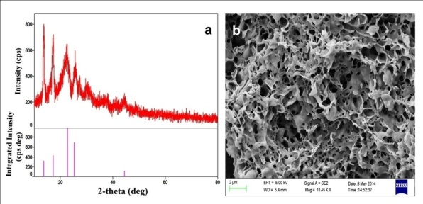 Fig. 6: (a) X-ray diffractogram and (b) Scanning Electron Microgram obtained for PHB produced by Bacillus cereus