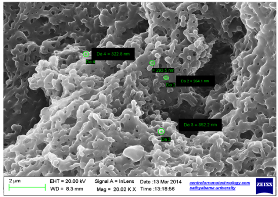 PHB nanoparticles with the size ranging 200–350 nm (fig. 7) were prepared by ultrasonication method. Nanoparticles prepared by these methods showed smooth surfaces free of major defects similar to the large nanoparticles synthesized by Xiong et al. [18]. But in contrast to his report the size was quite larger than the nanoparticles described by him which was in the range of 150–300 nm. These nanoparticles could be seen as spherical structures embedded in the PVA matrix. This procedure further requires modifications which can yield smaller nanoparticles with uniform size and with lesser PVA matrix.