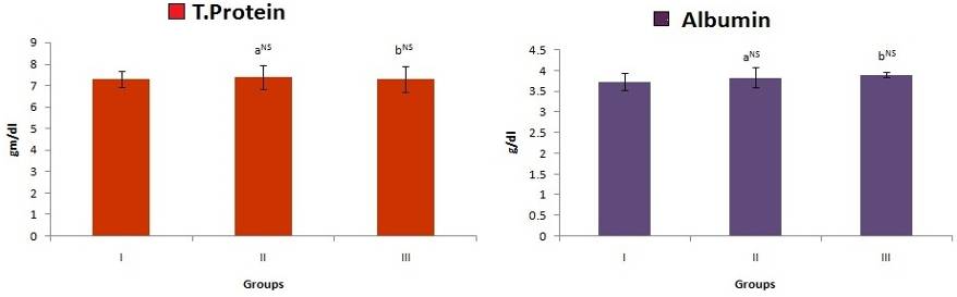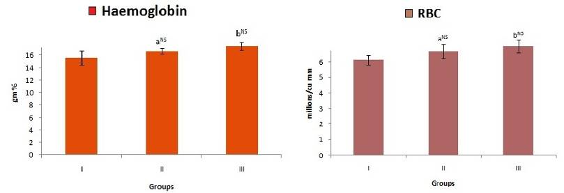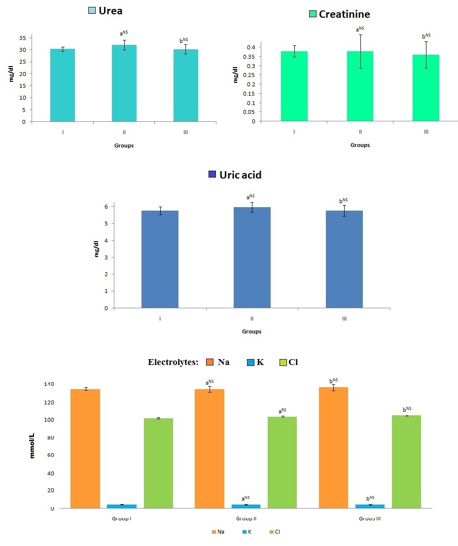 Data represents mean±SD of three animals in each group. Group I-Normal control; Group II-1000 mg/kg MA; Group III-2000 mg/kg MA. Comparisons are made between “a” group II versus group I, “b” group III versus group I; NS-non significant. Statistical comparisons were performed by one way Anova followed by Tukey’s HSD test using SPSS Software.