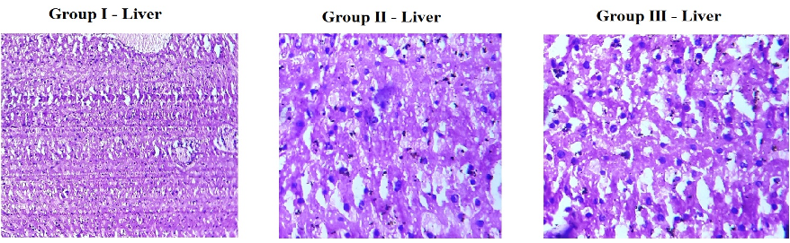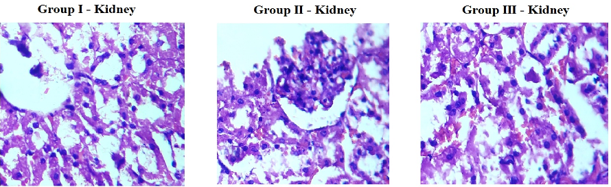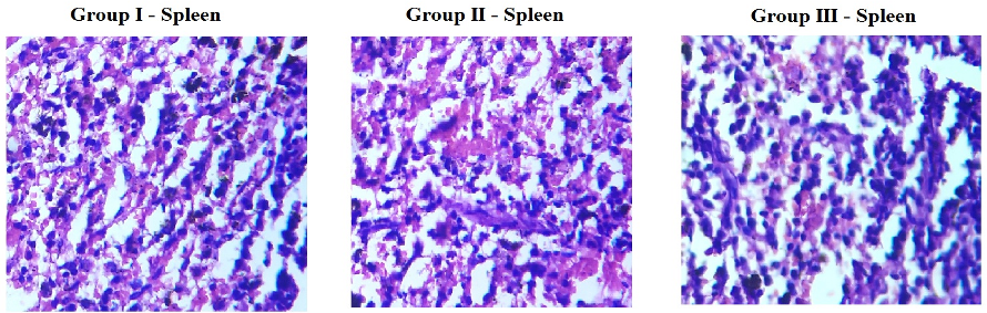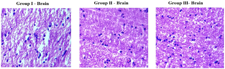 Histology photomicrographs of Mice Liver: Group I, II and III maintained normal lobular architecture; Mice Kidney: Group I, II and III revealed normal renal parenchyma with well-developed cortico-medullary differentiation; Mice Spleen: Group I, II and III maintained splenic architecture with the normal lymphoid follicle; Mice Brain: Group I, II and III are found with no signs of cell degeneration and necrosis.