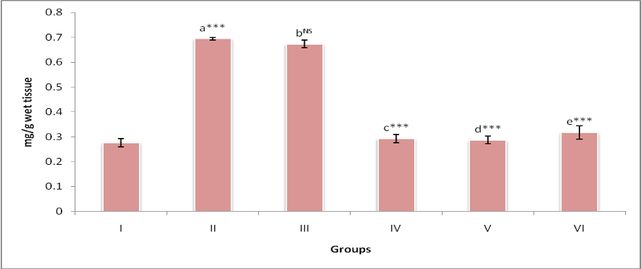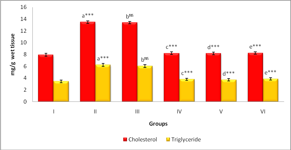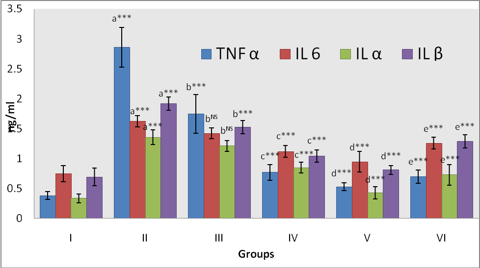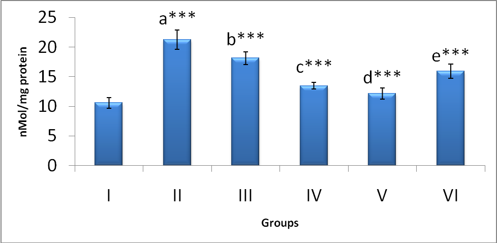Data represents mean±SD of six animals in each group. Comparisons are made between “a” group II versus group I, “b” group II versus group III; “c” group II versus group IV; “d” group II versus group V; “e” group II versus group VI. Statistical comparisons were performed by one-way Anova followed by Tukey’s HSD test using SPSS Software. Statistical significance: ***p<0.001, **p<0.01, *p<0.05 and NS non significant.