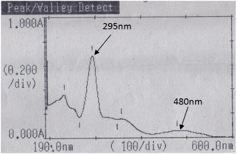 Fig. 5: Absorbance spectrum of MOX (λmax at 295 nm) and DXR (λmax at 480 nm) in 0.1M HCl