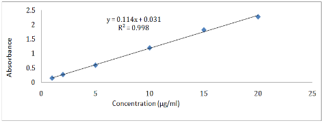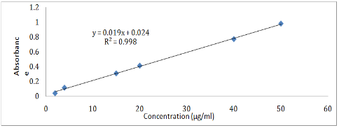 The calibration curve for DXR was linear over the concentration range of 1.5-50 µg/ml. The correlation coefficient value obtained was 0.998 with the regression equation y = 0.019x+0.024.