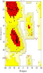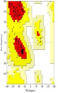 Fig. 3: Ramachandran Plot for the modeled RAD56 after refinement. The red, yellow, and white regions represent the favored, allowed, and disallowed regions, respectively