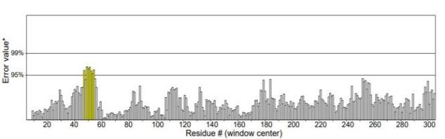 Fig. 4: ERRAT plot of ADAM12 modeled by (a) Swiss-model, (b) Phyre2, (C) I-Tasser, and overall quality factor or ERRAT score