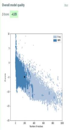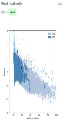 The approval of structure demonstrates gotten from Swiss-Model, I-Tasser, and Phyre2 were performed by reviewing the spine conformation of the modeled structure was calculated by analyzing the phi (φ) and psi (ψ) torsion points utilizing PROCHECK, as determined by Ramachandran plot. Based on an analysis of 118 structures of resolution of at least 2.0 Angstroms and R-factor no greater than 20%, a good quality model would be expected to have over 90% in the most favored regions. Residues in most favored regions [A, B, L] 156 88.6% Residues in additional allowed regions [a, b, l, p] 20 11.4% Residues in generously allowed regions [~a, ~b, ~l, ~p] 0 0.0% Residues in disallowed regions 0 0.0%. ERRAT could be a protein structure confirmation algorithm that is particularly well-suited for assessing the advancement of crystallographic show building and refinement. The program works by analyzing the measurements of non-bonded intelligence between different molecule sorts. Typically, greatly valuable in making choices about unwavering quality. Provecheck will give you a visual examination of the quality of a putative gem structure for a protein and analyzes the compatibility of a nuclear model of the protein with its amino acid arrangement.