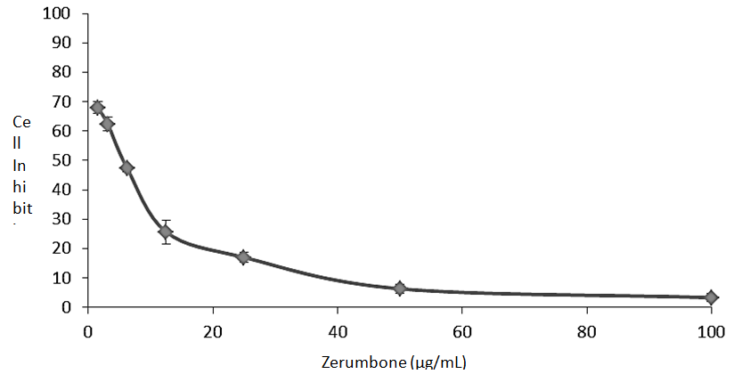 Zerumbone is a monocyclic sesquiterpene with chemical formula C15H2O and molecular weight of 218.340 dalton. The IUPAC name of this phytochemical is (2E, 6E, 10E)-2, 6, 9, 9-tetramethyl cycloundeca-2, 6, 10-trien-1-one [9]. This compound, isolated from the essential of Zingiber zerumbet Smith, possesses anticancer activity while practically harmless to normal cells [10]. The antiproliferative effects of ZER on several cancer cell lines like CaCo-2, HT-29 and HepG2 tumour cells occur via the apoptosis pathway and G2/M cell cycle arrest [11]. On cervical cancer cells, ZER not only induces apoptosis, arrests cell cycle at G2/M phase but also down regulates IL-6 [12]. Treatment of hepatic cancer cells with ZER elicit the down regulation of Bcl-2 and up-regulation of Bax expression, which significantly induce apoptosis. The effect of ZER is mediated through the action of Bcl-2 that reacts by blocking and interceding the Bax-induced events at several levels, preventing Bax redistribution after induction of the death signal [13]. In short, ZER balances the Bax to Bcl-2 ratio and enhances the Bax protein expression in liver cancers leading to cancer cell death. Thus, the aim of this study was to determine the antiproliferative effect of ZER and its role in the apoptosis of a liver cancer (HepG2) cell line.