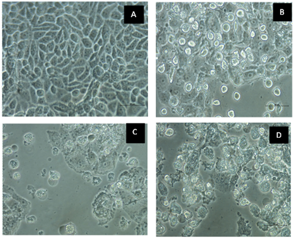Fig. 3: Hepatocellular carcinoma (HepG2) cell line treated with ZER at its IC50 concentration (6.20 µg/ml), A= Untreated cells, B = ZER 24 h, C = ZER 48 h, D = ZER 72h