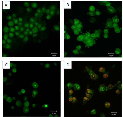 Fig. 4: Acridine orang/Propidium iodide-stained zerumbone-treated HepG2 cells after 72 h. IC50 (6.20 µg/ml) zerumbone concentration was used, (A) Untreated HepG2 cells. (B) ZER 24 h (C) ZER 48 h and (D) ZER 72h. V=Viable cells, B= Cell membrane blebbing, C=Chromatin condensation, LA=Late Apoptosis (400 × magnification)