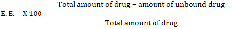Drug entrapment efficiency was determined by ultracentrifugation. The drug entrapmentefficiency was calculated from the ratio of the drug amount incorporated into SLNs to the total added drug amount. Ultracentrifugation was carried out using ultracentrifuge (Eppendorf centrifuge 5417 C, Netheler- Hinz- Gmbh), About 1 gm of SLNs dispersioncontaining the drug was placed in the centrifuge tube, and samples were centrifuged at 14, 000 rpm for 15 min. The amount of the drug in the supernatant was estimatedspectrophotmetrically at 235 nm for DP according to B. P 2009[11], 250 nm for TA according to B. P 2009 [11] and 633 nm against a blank after ion pair with crystal violet for ER [12].