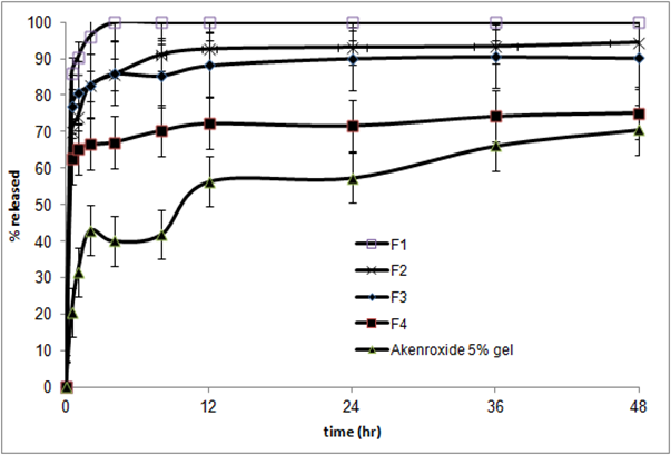 Fig. (1-3) showed that the release of drugs from formulae was enhanced significantly atlevel of P˂0.05 when compared with drugs only, drugs mixed Tween 80 and drugs mixedwith Tween 20 with the same proportions as in the formulae and also commercially availableformulations. Upon comparing the release of model drugs from prepared formulae, it was found thatformula F1better release efficiency than F3. Tween 80 used for the preparation of F1 gavesmaller size than that of Tween 20 used for the preparation of formula F3 with larger micellesize, but with lower solubilizing capacity of lipophilic drugs, and hence the lower dissolution ratethat result in lower release efficiency [21].