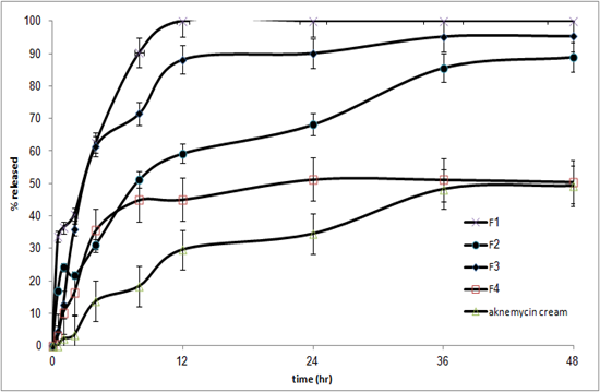 These studies were completed using horizontal water bath shaker (Clifton water bath, USA)that maintained at 60 cycles per minute and the dialysis bag that could retain SLNs and allow the diffusion of free drug into dissolution media. The bags were soaked in distilled water for 12 h before use. The release medium was 10 ml phosphate buffer (pH 5.5). The temperature was set at 32 ± 0.5 °C. A 1 gm sample of the drug loaded SLNs was instilled in adialysis bag held with two clamps at each end. At known time intervals (0.5, 1, 2, 4, 8, 12, 24, 36, and 48 h) the complete media were withdrawn and replaced by equal volumes offresh buffer to maintain sink condition. The samples filtered and assayed for each model drug spectrophotometrically (Dibenzoyl peroxide at 235 nm, erythromycin base at 633 nm according to Amin and Issa [12]while triamcinolone acetonide at 250 nm with Shimadzudouble beam UV- visible spectrophotometer model UV- 1601PC connected to a promaxcomputer fitted with UPVC personal spectroscopy software version 3.7 (ShimadzuCorporation, Kyoto, Japan). The experiments were carried out as triplicate for each releasestudy and the mean values were calculated [13].