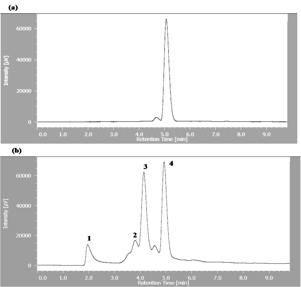 Fig. 1: HPLC profile of (a) standard citronellol and (b) pet ether extract