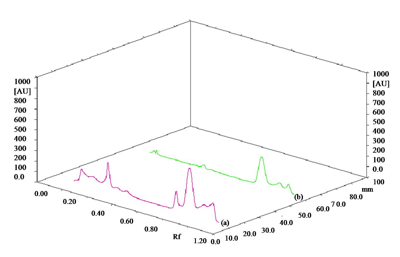 Fig. 2: HPTLC 3D profiling of (a) Pet ether extract (b) standard citronellol