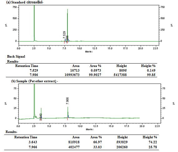 Fig. 3: Gas chromatogram of (a) standard citronellol and (b) pet ether extract