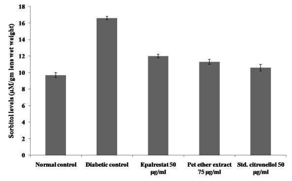 The goat eyeballs were obtained immediately after sacrification from a slaughterhouse and were transported to the laboratory at 0–4°C. The lenses were removed by extracapsular extraction and incubated in modified M-199 medium by the method of Kumar et al [21]. The lenses were divided into following groups (n= 6 in each group) - Group I - 5.5 mM glucose (normal control), group II- 50 mM glucose (diabetic control), group III- glucose 50 mM + Epalrestat 50 µg/ml, group IV- glucose 50 mM+ Pet ether extract 75 µg/ml, group V- glucose 50 mM + Citronellol 50 µg/ml. These lenses were incubated for 72 hrs at 37°C. The sorbitol content was determined by the method used by Hye- Lim Noh et al [22] with some modifications. After 72 hr incubation the lenses were homogenized and de proteinised by perchloric acid followed by neutralization then 2 ml assay mixture contained 0.1 ml of homogenate, 0.2 M glycine -NaOH buffer pH 9.4, 200 µM NAD+. Reaction was started by addition of 0.7 U/ ml sorbitol dehydrogenase enzyme and the absorbance was measured at 340 nm after 10 min.
