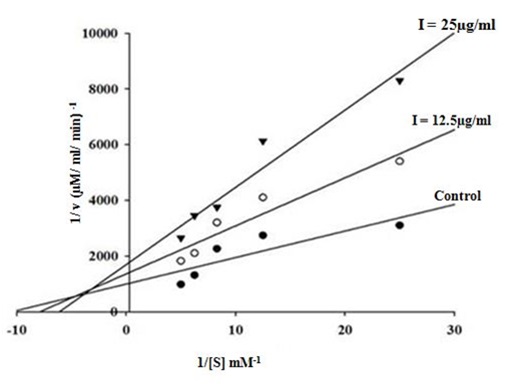 For the study of enzyme kinetics, the values of Km and Vmax were determined and the type of enzyme inhibition by citronellol was studied from Lineweaver-Burk plot using 12.5 and 25 µg/ml concentrations of citronellol with increasing concentrations of substrate (xylose) 40-200 mM [20].