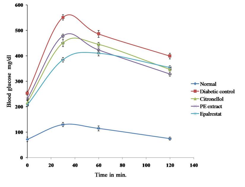 The oral glucose tolerance test was carried out as described by Andrade-Cetto et al [24] with some modifications. After overnight fasting of rats the initial blood glucose was measured using ACCU-CHECK glucometer. Animals were divided into five groups as normal control, diabetic control epalrestat 2.5 mg/kg Body Weight (BW), standard citronellol (2 mg/kg BW) and pet ether extract (10mg/kg BW). The components were given orally and after a gap of 10 min, glucose solution (3 mg/gm BW) was administered orally. Blood samples at intervals of 30 min up to 120 min were taken and blood glucose was measured using ACCU-CHECK glucometer.