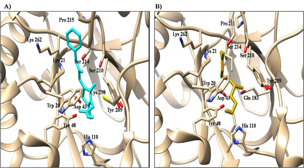 Fig. 7: Binding site of (A) Epalrestat (B) Citronellol with aldose reductase enzyme and its binding residues