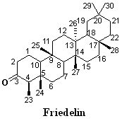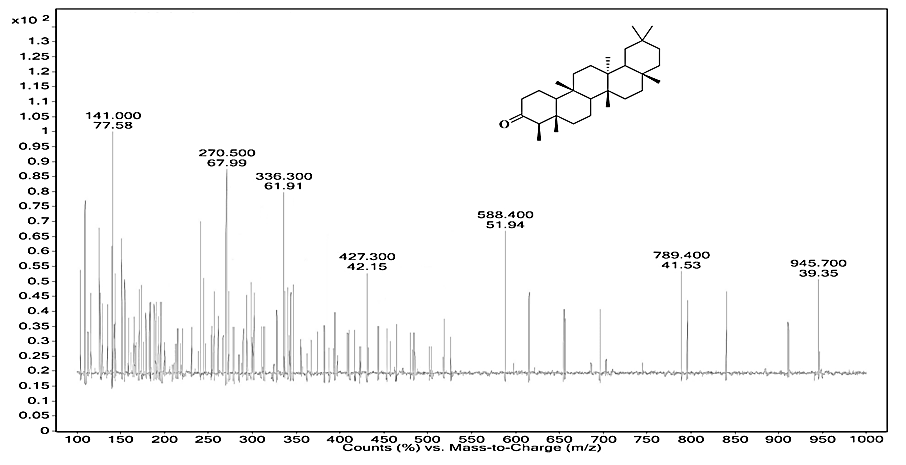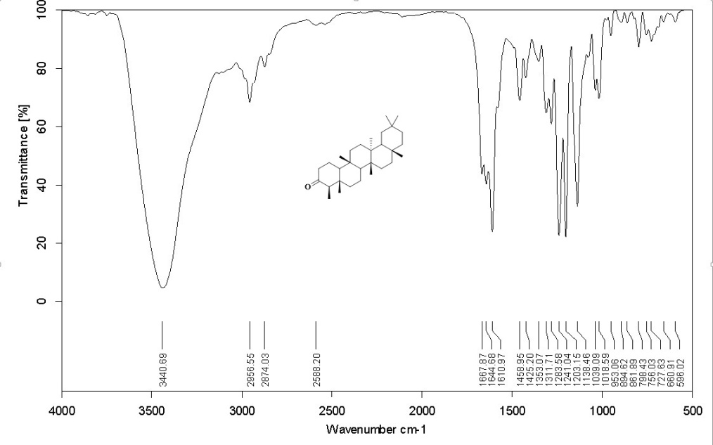 The compound was obtained as white crystals. It showed a positive Liebermann-Burchard test for steroids and/or triterpenes. Melting Point 2630C, UV λmax 267 nm, RF value 0.56 were obtained. The mass spectrum of the compound showed a molecular ion [M-H+] at m/z 427.30, which corresponds to the molecular formula C30H50O. The IR spectrum showed a band at 596.02, 660.91, 727.63, 756.03, 798.43, 861.89, 894.62, 953.06, 1018.59, 1039.09, 1138.46, 1203.15, 1241.04, 1283.58, 1311.71, 1353.07, 1425.20, 1458.95, 1610.97, 1644.68, 1667.87, 2588.20, 2874.03, 2956.55, 3440.69 cm-1. Synonym(s) of friedelin were Friedelin; Friedeline; 559-74-0; D: A-Friedooleanan-3-one; Friedelan-3-one