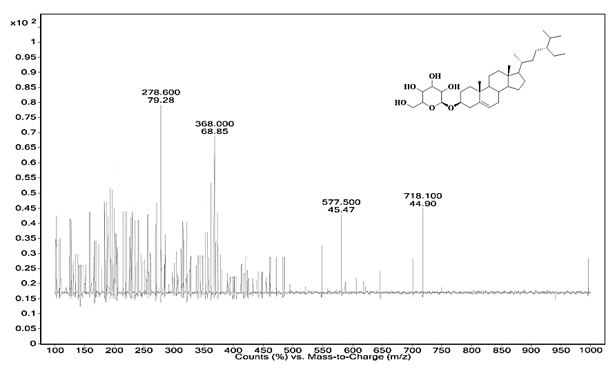 Structure elucidation of the compound GT-01 revealed the IR spectral data as broadband at 3435.45 cm-1 and other absorption bands at1636.71, C=C stretching frequency. The 1H NMR spectrum showed a doublet at for anomeric proton signal, which confirmed β-anomeric configuration. The 13C NMR indicated the presence of 35 carbon resonances. Out of which six-carbon signals for the steroidal nucleus of the aglycone moiety including the anomeric carbon peak and olefinic carbons six-carbon peaks are similar with those of β-sitosterol β-D-glucoside, which indicates the presence of β-D-glucoside or Daucosterol comparing with the reported 13C NMR data of β-sitosterol [17-21].