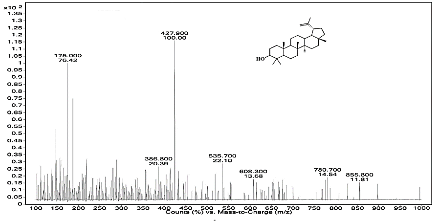 The compound was obtained as white power, mp 210oC, and analyzed ESI-MS: Mol. For: C30H50O, found m/z 427.90 [(M-H+), 100.00%], calcd. 426.73. The absorptions under UV were found to be λmax 350 nm and the RF value was found to be 0.64. The IR spectrum has shown broadband at 1023.35, 1456.68, 1646.32, 2928.97, 3426.57, 3747.67, cm-1. The 13C NMR spectral data revealed the presence of 30 carbons where seven methyl, ten methylene, six methine carbons, five quarternary carbons, and two olefinic carbons. The olefinic methylene protons on 29th carbon are seen as singlets at 4.54 (1H, s, =CH-29b) ppm, 4.79 (1H, s, =CH-29a) ppm. The 13C NMR data were in complete agreement with the existence of an isopropenyl group and a vinylic carbon atom. This supports the olefinic methylene protons seen as singlets at 4.54 and 4.79 ppm in the 1H NMR spectrum was found to be consistent with the known compound lupeol. Synonym of Lupeol, Fagarasterol, Clerodol, MonogynolB, Fragnasterol.