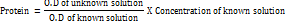 Prepared 10 tubes containing an increasing amount of BSA (1 mg/ml) (0, 100, 200, 300, 400, 500, 600, 700, 800, 900, 1000µg) in a total volume of 1 ml. 5 ml of reagent A (alkaline solution) was added to each test tube containing protein solution, vortexed, and allowed to stand at room temperature for 10 min. 0.5 ml of Folin’s phenol reagent was added and vortexed the tube for 60 min at room temperature. The absorbance was taken at 660 nm or 750 nm and p was the value A660 vs. concentration of BSA (µg). The same procedures were followed with the unknown solution, and its concentration was determined with the help of the graph. Protein was estimated by the method given by Lowry’s, et al. (1951). A protein reacts with Folins-Ciocalteu reagent to give a colored complex. The color so formed is due to the reaction of the alkaline copper sulfate with protein and the reduction of phosphor-molybdenate by tyrosine and tryptophan present in the reaction. The intensity of the color depends on the amount of this aromatic amino acid present [13].