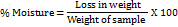 Calculation: The % moisture of sample was calculated after weighing the sample after drying, using the following expression: