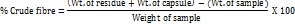 Calculation: The difference in weight of filter paper with residue minus filter paper was reported as the crude fibre content of the sample and it was expressed as per cent crude fiber using the following formula: