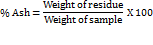 Calculation: The % Ash of sample was calculated after weighing the sample after drying, using the following expression: