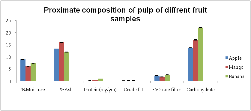 Fig. 2: Graphical representation of the proximate composition of different fruits samples. The data are displayed with mean±standard deviation (bars) of three replications (sample size±3)