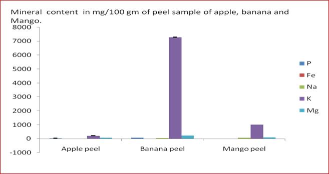 Fig. 5(a): Mineral contents (mg/100 gm) in apple, banana and mango peels. The data are displayed with mean±standard deviation (bars) of three replications (sample size±3)