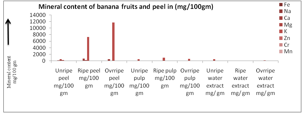 Conclusion: The investigation concluded that though all fruits are tropical and readily available all year around, but banana are cheaper and nutritionally rich. Banana peel has a low level of anti-nutritional factor, which makes it safe for human consumption. All stages of the banana peel are equally significant. Leaky ripe peels contain many valuable vitamins and minerals, ranging from iron (7.7±0.09 mg/100 gm) to phosphorus (36.6±0.19) to calcium (567.4±0.06 mg/100 gm) to Na (42.5±0.09 mg/100 gm) and K (11730±0.09 mg/100 gm), which can help to enrich soil fertility, and thus could be used as an organic fertilizer. Whereas, unripe banana peels could be used for many therapeutic purposes due to their high fiber, essential fat, and mineral content. Thus, they are not recommended to be thrown and used in for more socio-economic purposes.