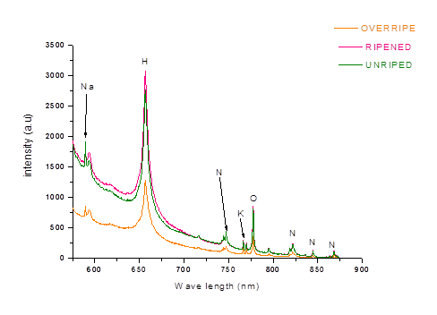 Fig. 6(a) and 6(b) and 6(c) show LIBS spectra of banana peel samples at various stages of ripening, which clearly demonstrate the presence of atomic lines of numerous minerals such as calcium (Ca), magnesium (Mg), carbon (C), phosphorous (P), potassium (K), nitrogen (N), sodium (Na), chromium (Cr), sodium (Na), and potassium (K) (K). The existence of the above minerals in these food supplements is clearly demonstrated by these data. In overripe banana peel, K and Ca were detected at wavelengths of 400 nm and 420 nm, respectively, as shown in fig. 6(a), whereas N was detected at wavelengths of 420 and 465 nm in overripe banana peel. Overripe banana peels had higher levels of calcium and potassium. At wavelength 280, an intense Mg peak was detected. Fig. 6(b) demonstrates that unripe banana peels have a higher Mg concentration than ripe and leaky ripe banana peels. Fig. 6(c) shows the potassium content of an unripe banana peel measured at a wavelength of 765 nm. While, a sharp intensity peak of Na was noticed at a wavelength of 580 nm. Fig. 6(c) shows an intense peak of N at wavelengths of 750 nm, 830 nm, 850 nm, and 870 nm.