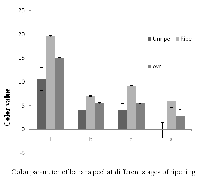 The visual colors of banana peel at different stages of ripening were measured using X-rite colorimeter and expressed in terms of the L' a' b" system. The Colorimeter was calibrated using a white reference standard tile, as described by Rangana, (2005) [8]. Color function C (Chroma) was calculated using the formula by Fugita et al. (2004) [9].