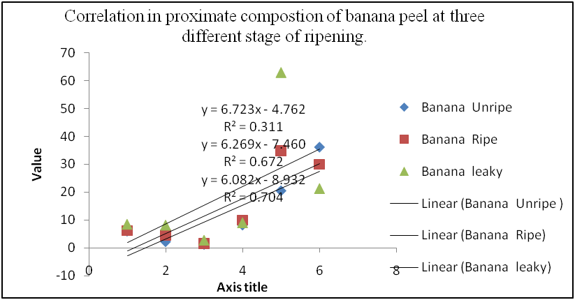 Fig. 8 depicts the linear correlation between nutrient content at different stages of banana peel. Highest correlation was observed in leaky stage of banana peel. Significant difference (P<0.001) was found in leaky ripe banana peel. Highest correlation in minerals was oserved in leakyripe banana peel (R2= 0.7041). where, as unripe sample shows correlation (R2= 0.311), which is less.