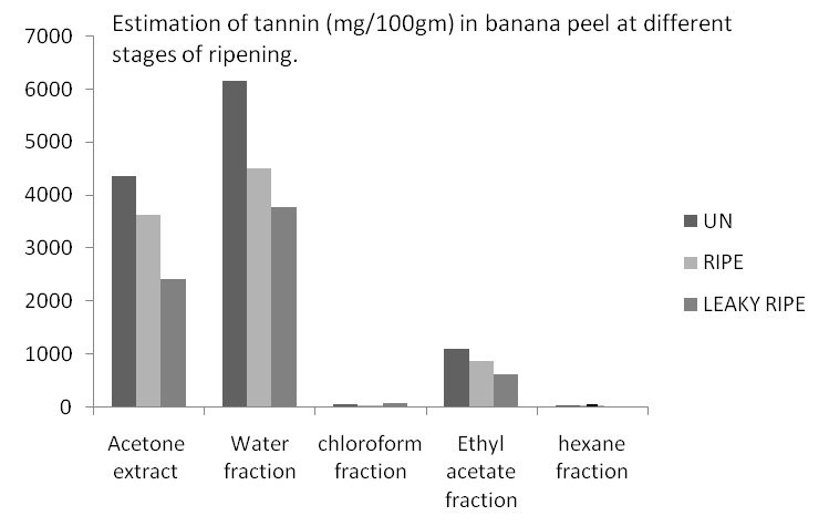 Unripe water fractionate had the highest tannin content in contrast to 70 percent acetone extracts, ranging from 6160±0.12 to 4360±0.057 mg/100 gm, as shown in fig. 10. Tannin was found to be high in the unripe stage of banana peel. The largest concentration of tannin is found in a water extract of banana peel. The aforementioned result demonstrates that tannin is polar in nature, allowing for the most extraction in a water solvent.