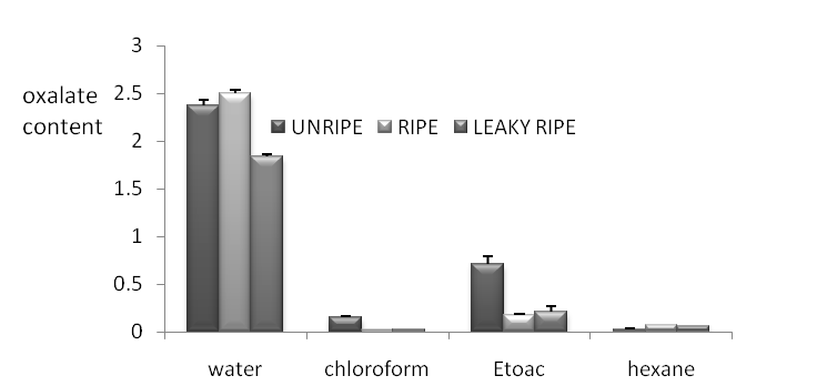 Fig. 11 shows that the oxalate concentration in the unripe water fraction was determined to be (2.37±0.061 mg/100 gm), but it was found to be 1.84±0.018 mg/100 gm in the leaky stage.