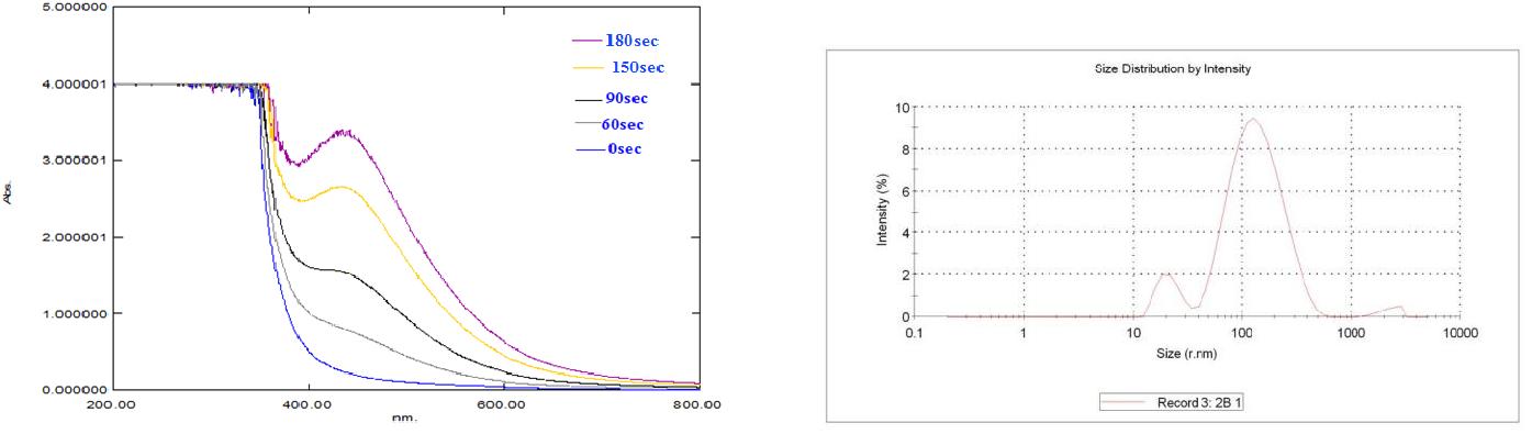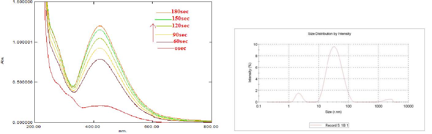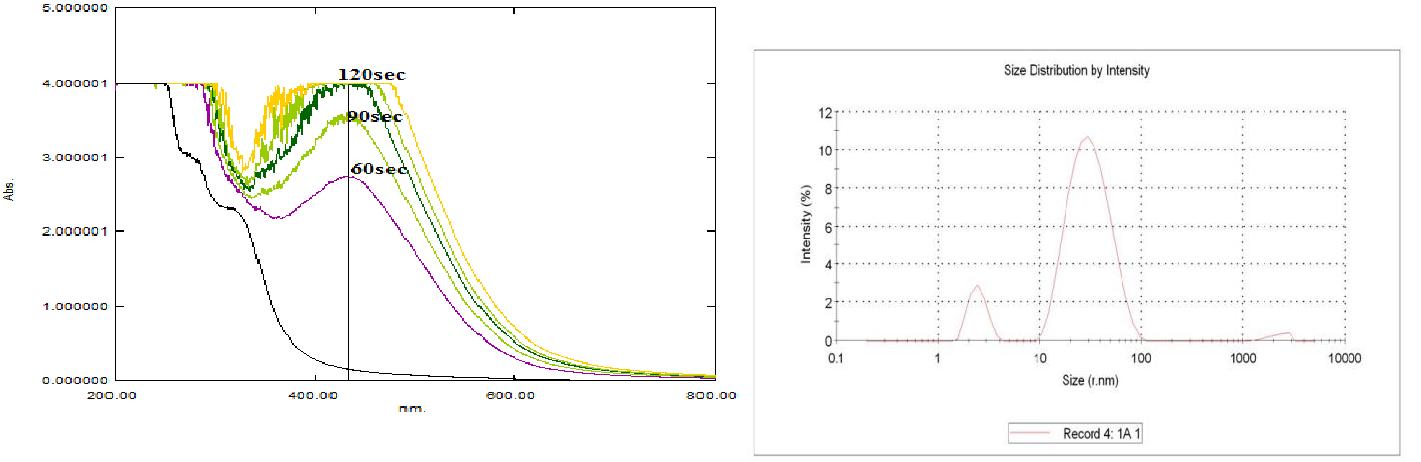 Fig. 1(a) & 2 (a): UV-Vis absorption spectra and DLS of green synthesized silver nanoparticles prepared with 0.02 gm/ml concentration of leaf extract