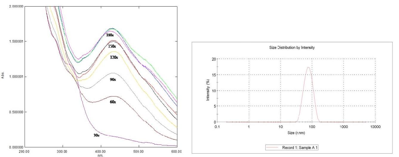 Fig. 1(b) & 2 (b): UV-Vis absorption spectra and DLS of green synthesized silver nanoparticles prepared with 0.01 gm/ml concentration of leaf extract