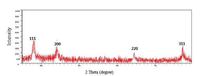 The X-ray diffraction (XRD) analysis showed diffraction peaks corresponding to fcc structure and crystallinity of silver nanoparticles. Intense peaks were observed at 38.30, 44.50, 64.60, and 77.50 (fig. 5), corresponding to 111, 200, 220, and 311 Bragg’s reflection, respectively (JCPDS, silver file no. 04-0783).