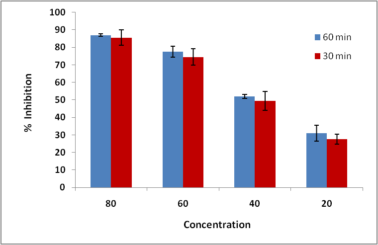 Antioxidant activity refers to the inhibition of the oxidation of molecules by inhibiting the initiation step of the oxidative chain reactions and the formation of stable radicals, which are non-reactive. The colorimetric assay of silver nanoparticles synthesized from N. arbor-tristis leaf extract was performed to confirm the presence of antioxidant compounds capped on the AgNPs. The antioxidant activity was evaluated using DPPH assays and was found to increase with the increasing concentration of nanoparticles. The assay revealed the maximum antioxidant activity to be 87 % at 100µg/ml of AgNPs. The results of antioxidant assays are shown in fig. 6. The plant mediated nanoparticles exhibited effective radical scavenging activity. These experiments revealed that the antioxidant properties of AgPNs generated by the leaf extract has been retained possibly due to the capping on the AgNPs.