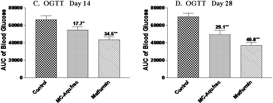 Fig. 1 shows the remarkable effect of aqueous fraction on fasting blood glucose of treated animals. A highly significant improvement of 31.8% (p<0.01) and 56.0% (p<0.01) was observed in fraction treated group respectively on days 14th and 28th post treatment. The lowering observed on day 28th was even greater than the metformin treated group i. e., 47.3% (p<0.01) (fig. 1A and B). It also had a positive impact on oral glucose tolerance and significant improvement of 17.7% (p<0.05) and 29.1% (p<0.01) was registered on days 14th and 28th post treatment (fig. 1C and D). Plasma insulin level, which gets elevated in HFD-STZ rats was also brought down from 19.7% (p<0.05) as compared to an untreated control group (fig. 1E).