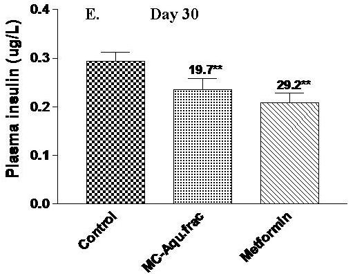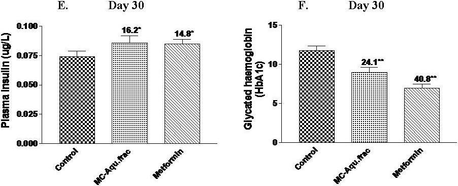 Fig. 1: Effect of the aqueous fraction of aqueous extract of M. charantia fruits and standard drug metformin on fasting blood glucose (A and B), oral glucose tolerance (C and D) and plasma insulin level (E) of high fructose diet fed low dosed STZ-induced diabetic rats during 30 days of treatment. Significance *p<0.05; **p<0.01