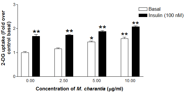 Fig. 3: Concentration-dependent effect of aqueous fraction of aqueous extract of M. charantia fruits on 2-deoxyglucose uptake in L6 myotubes. Cells were incubated for 16 h with different concentrations of aqueous fraction. After incubation myotubes were left untreated (white bars) or stimulated with 100 nM insulin (black bars) for 20 min, followed by the determination of 2-DG uptake. Results are expressed as fold stimulation over control basal. Significance *p<0.05, **p<0.01