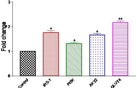 Gene expression profiles in fig. 4 suggest that the expression of IRS-1 (Insulin receptor substrate, PI3K (Phosphatidylinositol 3-kinase), AKT2 (Protein kinase-B) and GLUT4 genes were upregulated by the treatment of aqueous fraction. Thus, it is clear that the aqueous fraction of M. charantia stimulates the genes of insulin signaling pathway which may lead to the antihyperglycemic effect of the fraction.