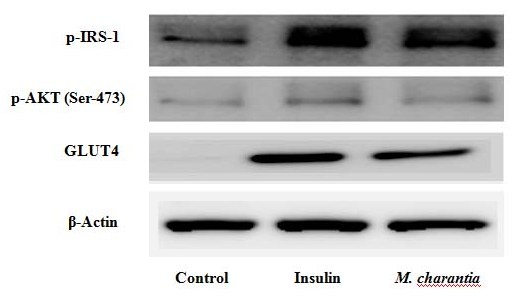 Fig. 5 shows that similar to the gene expression profile, treatment of aqueous fraction increases the protein expression of of p-IRS-1, p-AKT and GLUT4. Thus, it is clear that the aqueous fraction of M. charantia does effect insulin signaling pathway in in vitro and as a consequence increase glucose uptake by cells.