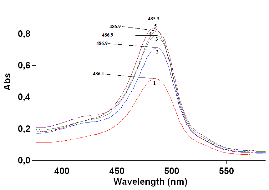 Fig. 2: Absorption spectra of glucose (SS) and extracts by acid hydrolysis reaction. 1--standard, 2-extract (extraction time tE=15 min, 3-tE=120 min, 4-tЕ=30 min, 5-tЕ=90 min (n=3, p<0.05)