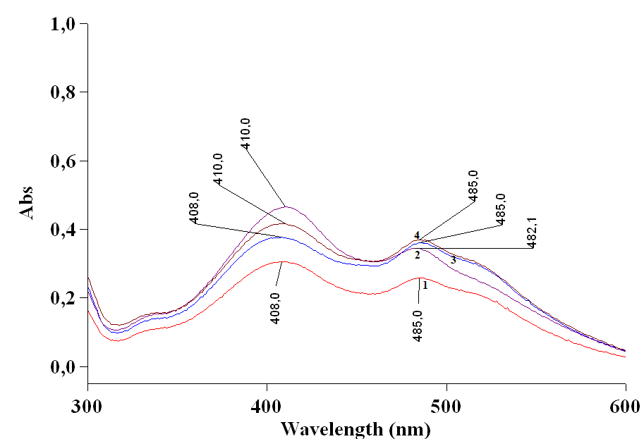 Fig. 3: Absorption spectra of reaction products of standard samples of fructose and extracts from Lycium barbarum L. fruits obtained with resorcinol, 1-Standard solution; 2,3,4-Extract solutions